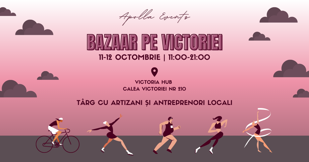 Bună! Avem plăcerea de a vă invita pe 11-12 octombrie la Bazaar pe Victoriei, ediție de la Apolla Events în cadrul căreia continuăm să susținem și să promovăm micile afaceri locale într-un cadru fresh, plin de tineret și voie bună. Vremea răcoroasă și melancolică de Brumărel creează atmosfera perfectă pentru cumpărături și nu ne face decât să vă invităm la o plimbare de toamnă cu destinația: shopping local pentru a putea descoperi produse unice realizate cu migală de către oameni talentați.