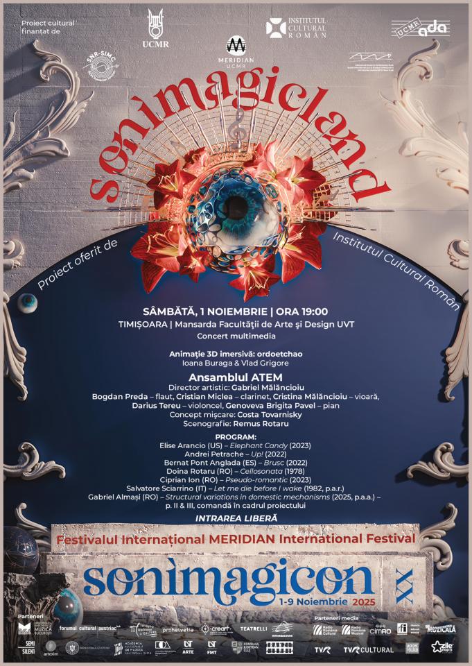 Tema festivalului, SONIMAGICON (2024-2026), explorează relaţia strânsă dintre MUZICĂ şi IMAGINE, în toate formele ei. Pregătiţi-vă urechile curioase pentru un festin eclectic: video-art (animații 3D, scurtmetraje, live video interactions) şi muzică nouă, dans şi performance contemporan, recital-expoziție de modă, percuție underground, show hibrid radio-tv, muzici electronice şi instalație sonor-performativă.