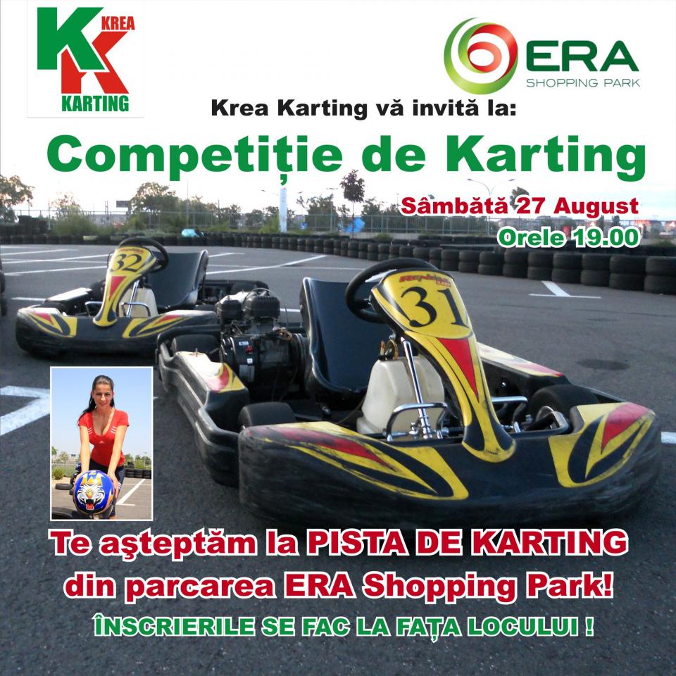Competitia de Karting, aflata la cea de-a treia editie, se va desfasura sambata de la ora 19:00, pe pista KREA Karting de la ERA Park. Concursul este deschis pentru adulti si va dura aproximativ trei ore. Participantii se vor intrece in maiestrie si viteza si vor primi cupe si diplome. Taxa de participare este de 40 de lei.