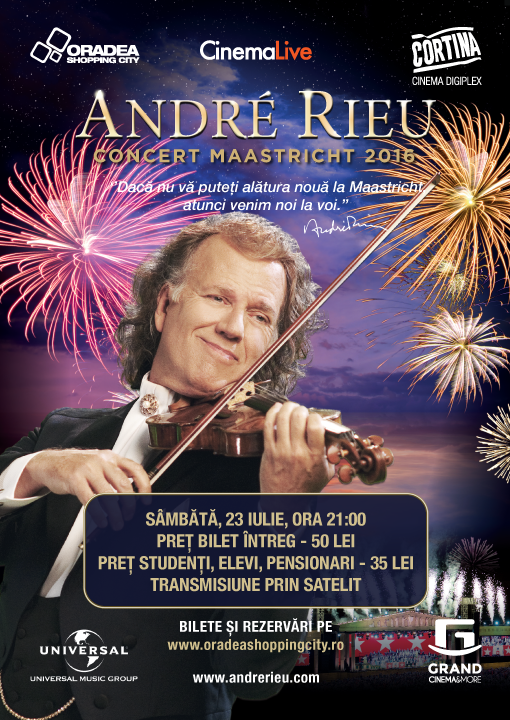 Biletele pentru Concertul André Rieu – Maastricht 2016 se pot achiziționa direct de la casele de bilete Cortina Cinema Digiplex.