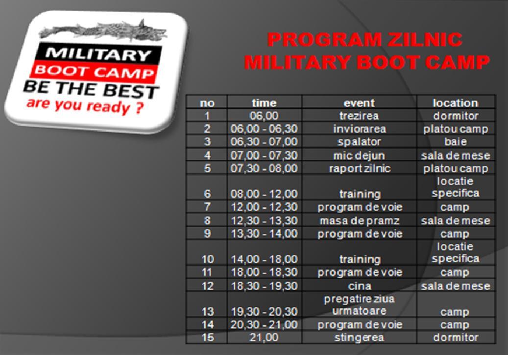 Mai multe detalii: https://www.facebook.com/Military-Boot-Camp-1358120527594180/
