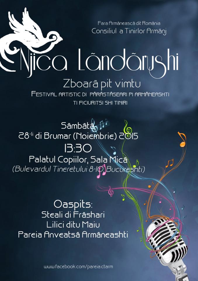 Consiliul Tinerilor Armani din Comunitatea Armana din Romania organizeaza sambata, 28 noiembrie 2015, ora 13:30 a treia editie a Festivalului Njica Landarusi ce va avea loc la Palatul National al Copiilor, Sala Mica, Bucuresti (Bulevardul Tineretului, nr. 8-10).