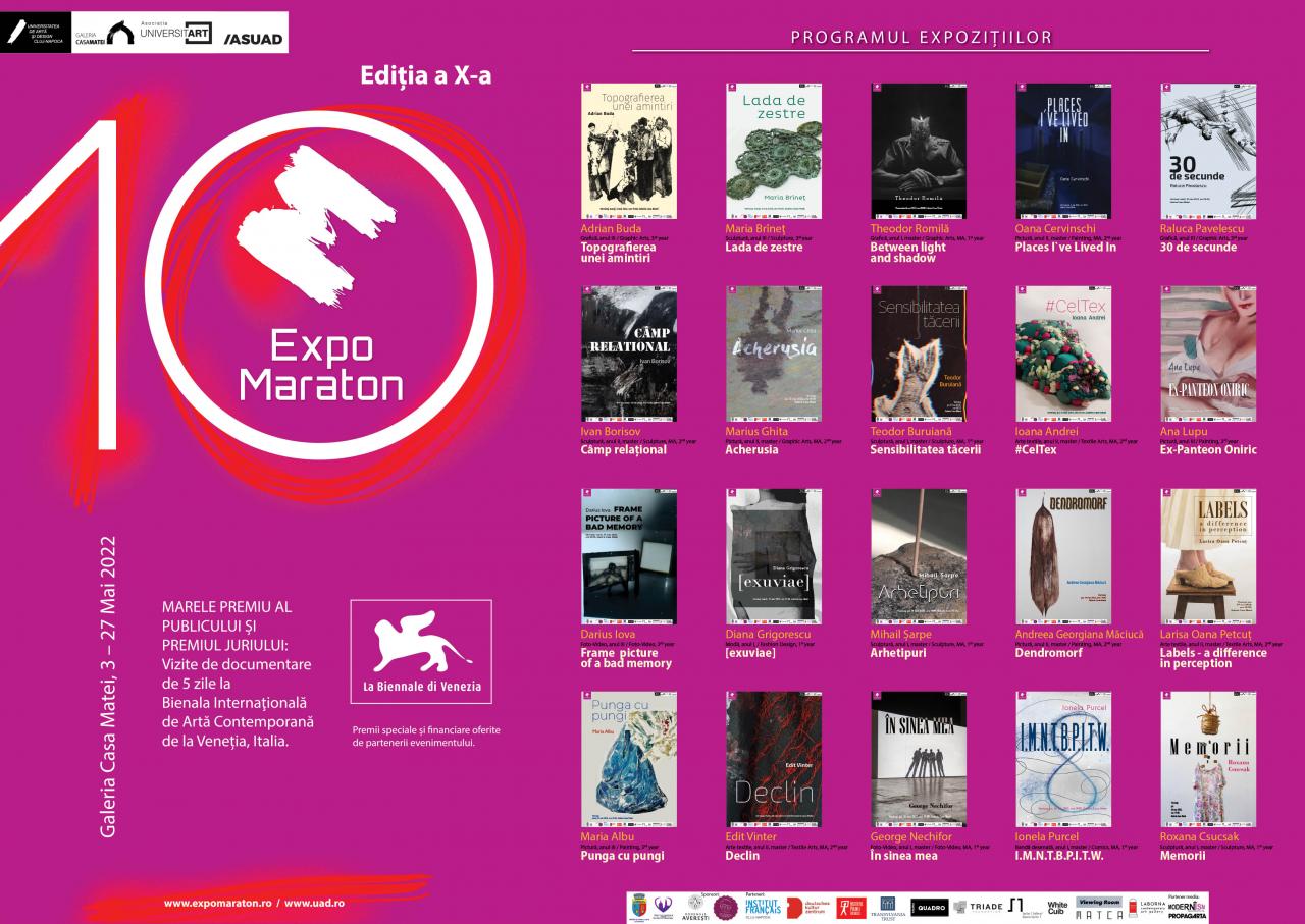 Universitatea de Artă și Design din Cluj-Napoca, Galeria Casa Matei, Asociația Universitart a UAD Cluj-Napoca și ASUAD organizează în perioada 3–27 mai 2022 cea de-a zecea ediție a “EXPO MARATON”, competiția de proiecte expoziționale individuale ale studenților și masternazilor UAD. Având în vedere situația impusă de pandemia de Covid 19 care, în ultimii doi ani, nu a permis desfășurarea evenimentului marca UAD, Expo Maraton aduce anul acesta în fața publicului 20 de expoziții cu diferite forme de expresie artistică și concepte variate. Memorii afective, spații intime sau peisaje cotidiane, percepții onirice, realitatea, corporalitatea sunt doar câteva dintre tematicile illustrate în universurile creative ale tinerilor artiști, redate în expoziții de pictură, sculptură, desen, gravură, animație, fotografie, instalații sau performance.