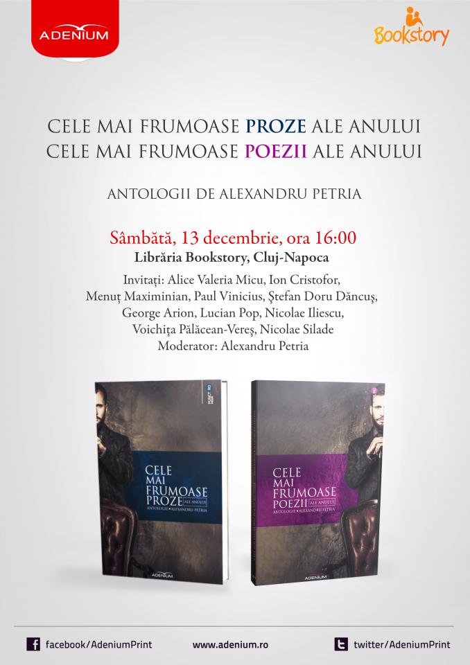 Sâmbătă, 13 decembrie 2014, ora 16:00, în spațiul librăriei Bookstory din Cluj-Napoca, editura Adenium lansează două antologii coordonate de Alexandru Petria.