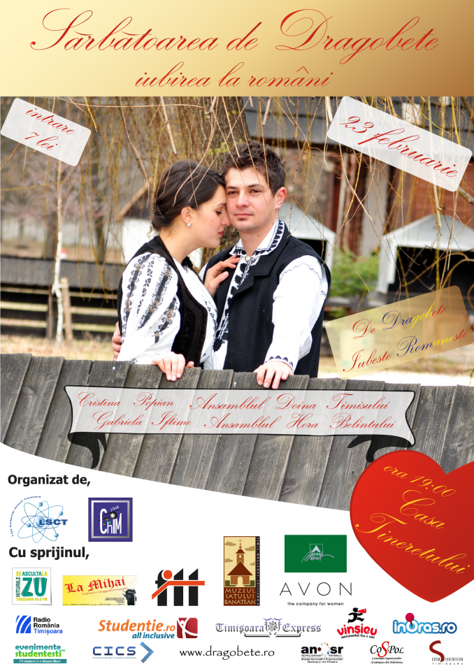 Liga Studentilor Chimisti din Timisoara pregateste pentru voi cateva momente de traditie pur romaneasca, iar pentru ca impreuna vrem sa iubim romaneste. Sarbatoarea de Dragobete la romani - Iubirea la romani -, este genul de sarbatoare care trezeste in toti spiritul de romantici incurabili si ne ajuta sa pastram autenticitatea autohtona intacta. In luna februarie se iubeste. Se iubeste in stilul dulce romanesc, in cel mai curat si mai intens mod. Este zi de primavara, iar natura revine la viata. Dragobetele, in traditia popular, este considerat ca fiind fiul Babei Dochia si deschizatorul primaverii, personaj care oficia in cer, la inceputul fiecarei primaveri, nunta tuturor animalelor.